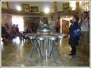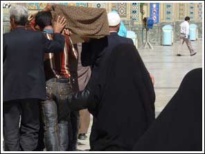 Vrijdag bezoeken we het heiligdom van Imam Reza. Mashad is voor de Sunieten een belangrijk heiligdom. Imam Reza is de 8ste Imam en ligt hier begraven. Er komen 15 mio. pelgrims per jaar. Het duurt even voordat we toestemming hebben om het terrein te betreden. Een excursie verloopt in Iran chaotisch en met veel discussie. De dames moeten zich ondanks hun gepaste kleding, hullen in een witte bloemetjes chador dat het hele lichaam en haar bedekt. Na gefouilleerd te zijn, lopen we over de grote binnenplaatsen. We worden nagestaard door de gelovigen. De gebouwen en vele moskeeën zijn uitbundig versierd met tegels. De minaretten zien eruit als reusachtige lantaarns. Het is druk. Vooral vrouwen gekleed in het zwarte volledig bedekkende gewaad. Begravennissen vinden achter elkaar plaats. We mogen niet de moskee binnen. Na geduw en getrek door onze gids bij de bewakers, mogen we een presentatie-ruimte binnen, waar een film over het heiligdom wordt gedraaid. Daarna bezoeken we een museum over de historie van het religieuze complex. Na het eten lopen we door de bazar: kruiden, specerijen, dameskleding. De mensen zijn er vriendelijk en geïnteresseerd 's Avonds vieren we de verjaardag van Sigi. Er is alkoholvrij bier. Het maltbier is goed te drinken. Het aardbeien- en bananen-bier smaakt ons niet. Het koelt 's avonds snel af. Dat is fijn voor het slapen. |