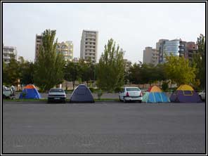 We bezoeken de binnenstad van Tabriz (1,5 mio). Ook hier is er druk autoverkeer. We bekijken de blauwe moskee, een na aardbevingen sterk gerestaureerd gebouw. Daarna het Azerbedjaans museum waar voornamelijk gebruiksvoorwerpen van de voor-islamitische periode te zien zijn. De meerderheid van de inwoners spreekt Turks en geen Farsi. De stad heeft een rommelige gezelligheid. We slenteren een paar uur door de bazar en eten er weer een kebabje. 's Middags gaat Ingrid met Hossein mee naar een banketbakkerij om gebak te kopen voor het afscheid. We komen in een enorme winkel met allerlei soorten gebakjes, koeken en taarten. Het is de bedoeling dat je eerst proeft wat je gaat kopen. Dus na 2 gebakjes, 1 roomsoes en een koek is de keuze gemaakt. Er verdwijnen 80 gebakjes, soezen en koeken in dozen. Deze worden gewogen en afgerekent. Men betaald naar gewicht en niet aantal.'s Avonds nemen afscheid van onze Iraanse gidsen Hossein en Ali. We drinken thee met gebak in het water- paviljoen. Het spettert een beetje, regen kan je het niet noemen. De temperatuur daalt snel naar 10 graden. We moeten er aan wennen. We doen nog inkopen om ons laatste Iraanse geld op te maken. 18 oktober staan we om half vijf op om op 6.00 uur te starten voor een rit van ruim 200km naar de Armenische grens. Het is nog donker als we de snelweg oprijden. Er staan bij op- en afritten vele mensen die wachten op een bus of een lift. Na de zonsopgang rijden we door een prachtig berg-landschap tot aan de grens met Azarbaijan. Dan volgen we de grens-rivier door een smalle kloof. We rijden door naar de plaats Norduz waar de grens is met Armenië. We hebben 4918km gereden in Iran. De grens-procedures duren 11,5 uur. De grens van de Armenen wordt bewaakt door Russische soldaten. 2 maal wordt onze camper grondig gecontroleerd. Bij anderen worden messen gevonden die ze in China gekocht hadden, deze worden in beslag genomen en vernietigd. We betalen 42 euro voor het invoeren van onze camper en 11 euro voor een basis WA-verzekering. Het opmaken van het importdocument duurt (per camper) 1 uur. We lopen van loket naar loket. We zetten om 20.00 uur onze camper op een parkeerterrein even buiten het douane terrein in Armenië. |